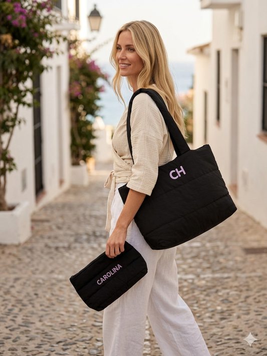 Gepersonaliseerde Puffy tas + toilettas set - luxe lichtgewicht shopper met initialen